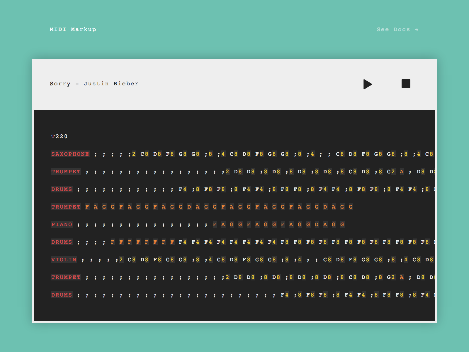 MIDI Markup is a music markup language and synthesizer for visually impaired composers. After listening to talks at SXGood about accessibility and technology, we decided to focus our efforts on helping blind, and visually-impaired people in music. Our product is more accessible than other music markup languages and helps users navigate interfaces with audio queues.